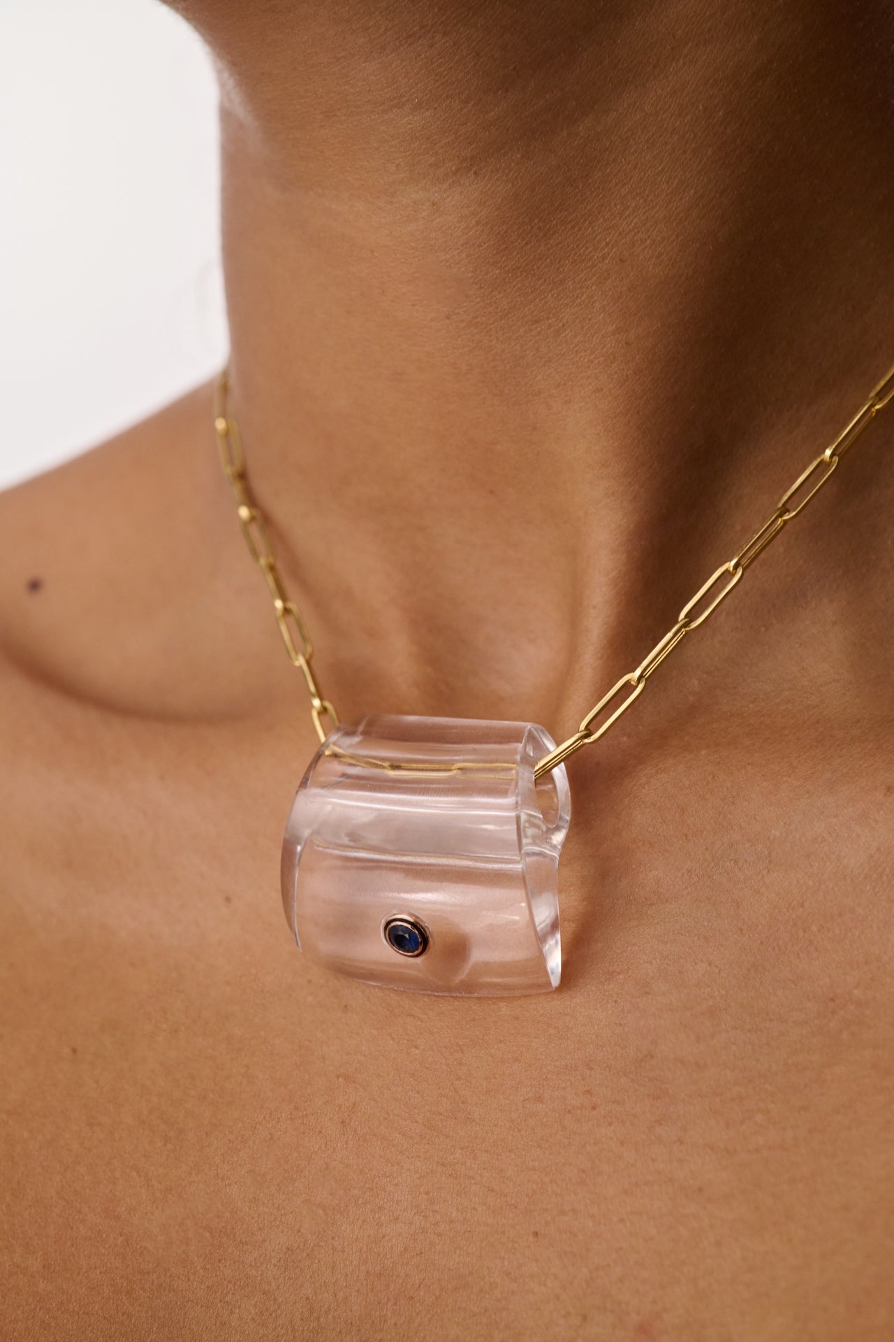 Introducing The AIR PENDANT: A one-of-a-kind hand-carved Quartz crystal inlaid with a deep blue sapphire, set in 14K yellow gold. Inspired by the movement of the wind, this pendant captures the essence of fluidity and freedom. Each crystal and gemstone is chosen with great care to ensure the highest quality. Handcrafted with precision and artistry.