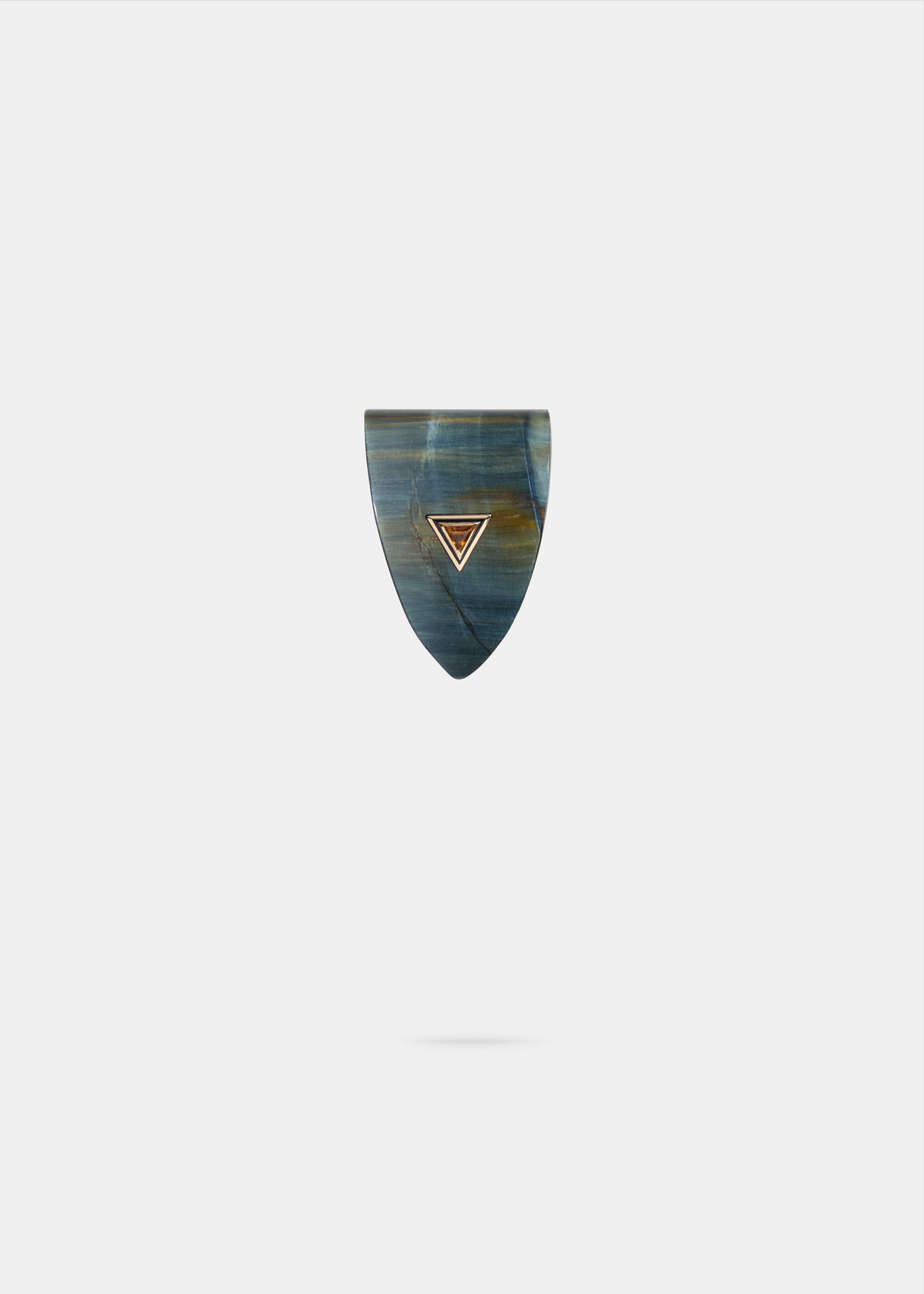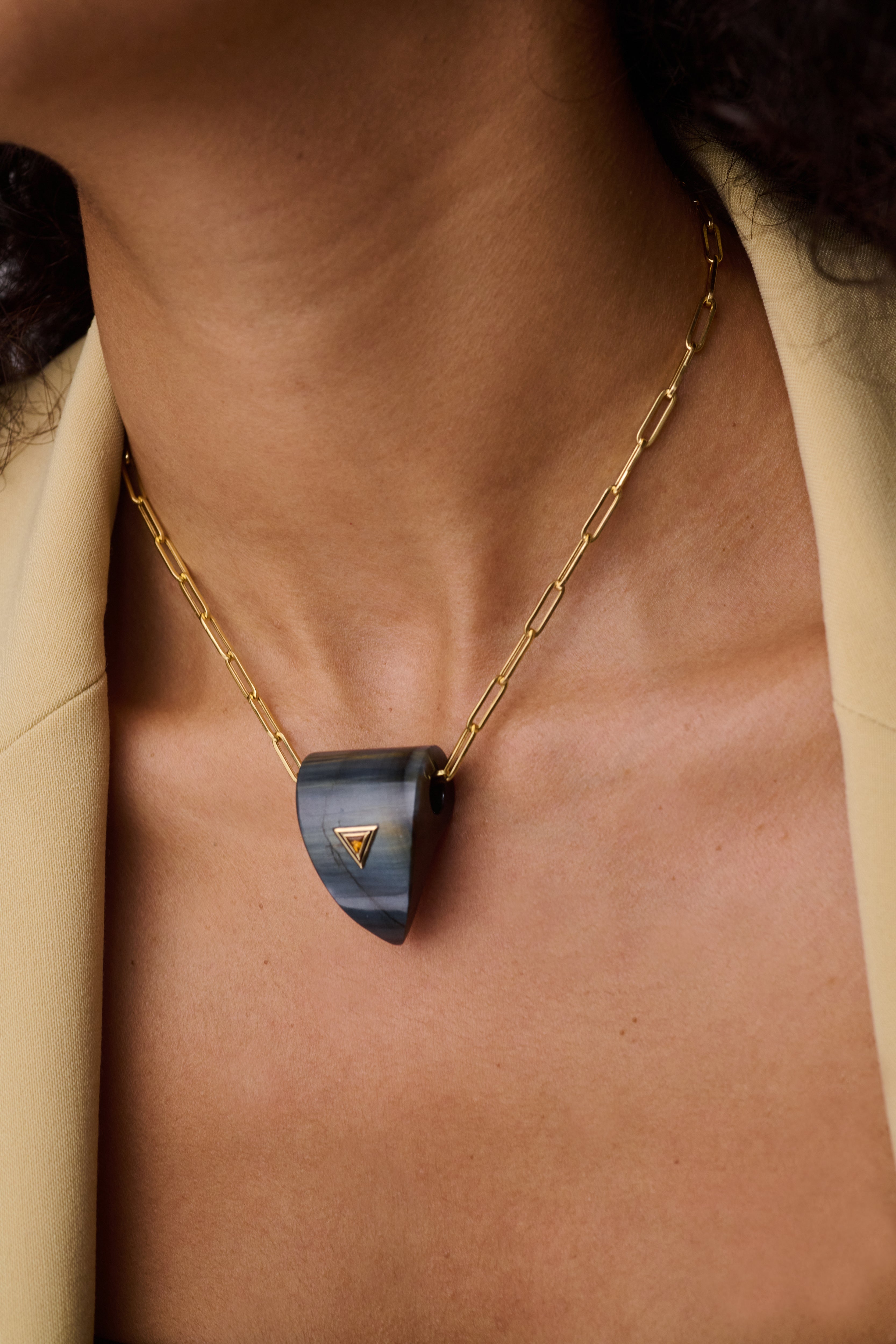 Introducing The TRIA PENDANT: A one-of-a-kind hand-carved Blue Tiger’s Eye crystal inlaid with orange citrine, set in 14K yellow gold in a rounded triangular shape. Each crystal and gemstone is chosen with great care to ensure the highest quality. Handcrafted with precision and artistry, this unique piece combines elegance and balance, embodying pure beauty and timeless craftsmanship.