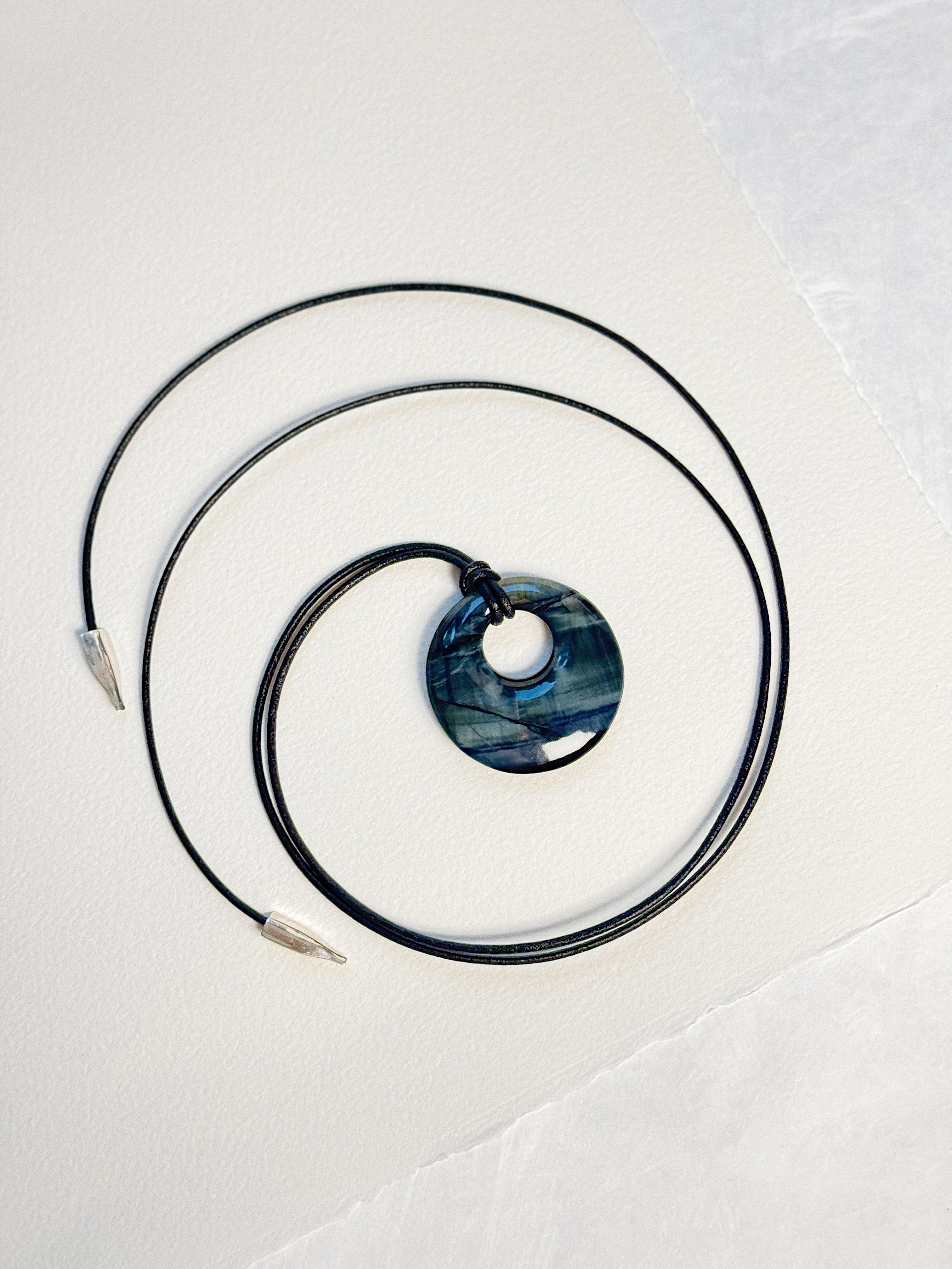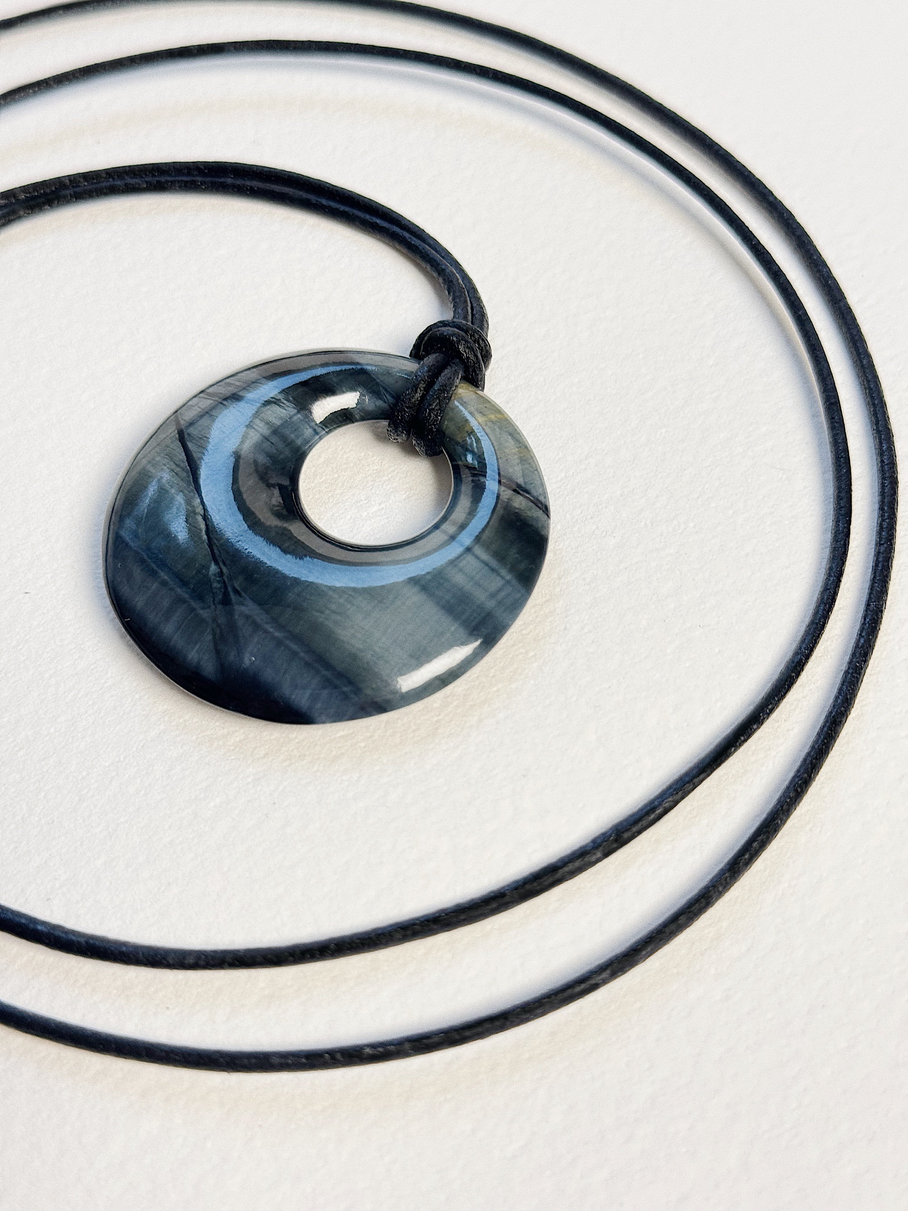 The Luna necklace features a hand-carved natural blue tiger eye pendant, embodying the artistry of traditional craftsmanship. Suspended from a supple black leather cord and adorned with sterling silver accents, this necklace exudes understated luxury.