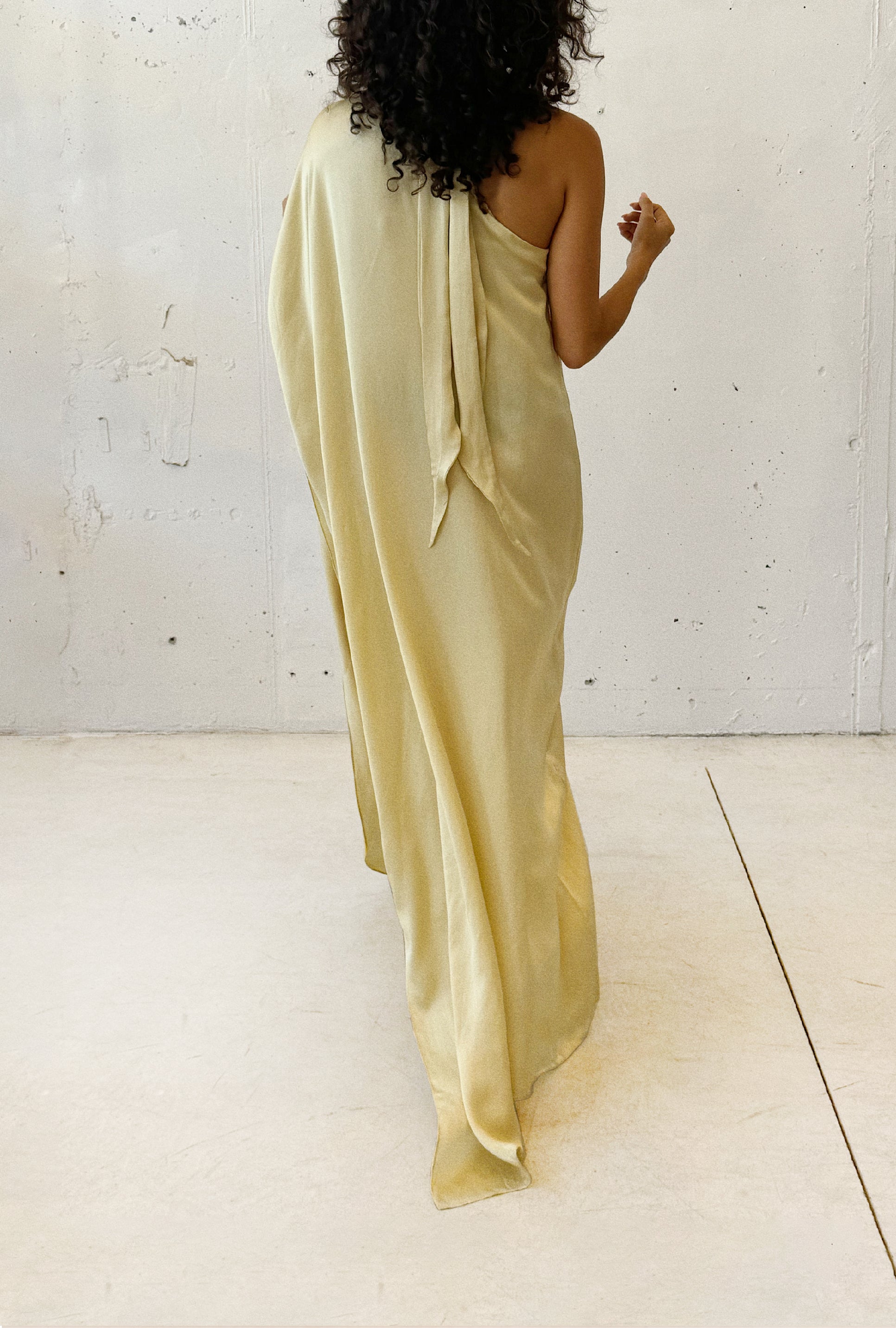 Experience the luxury of sustainable fashion with the Luna Dress, crafted from 100% organic silk and naturally dyed to a rich light yellow. This elegant piece comes with a matching scarf, adding a touch of sophistication and versatility to your look.