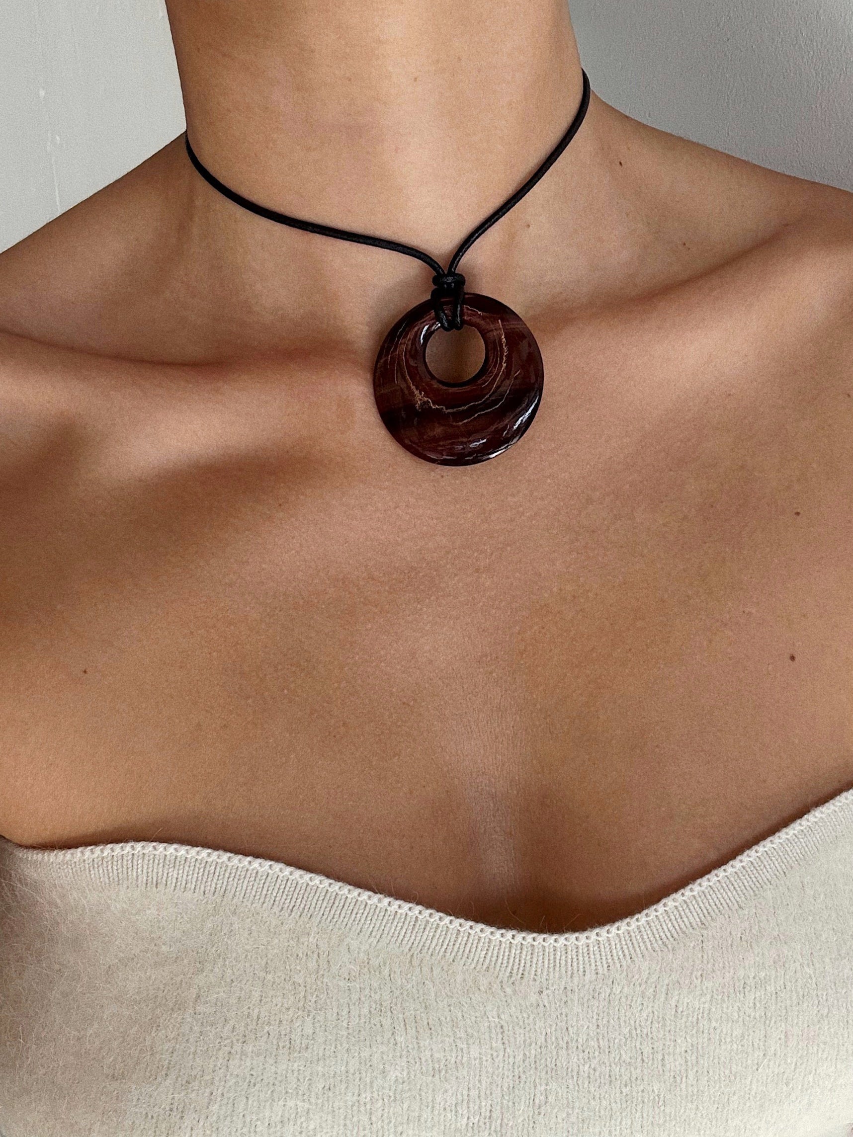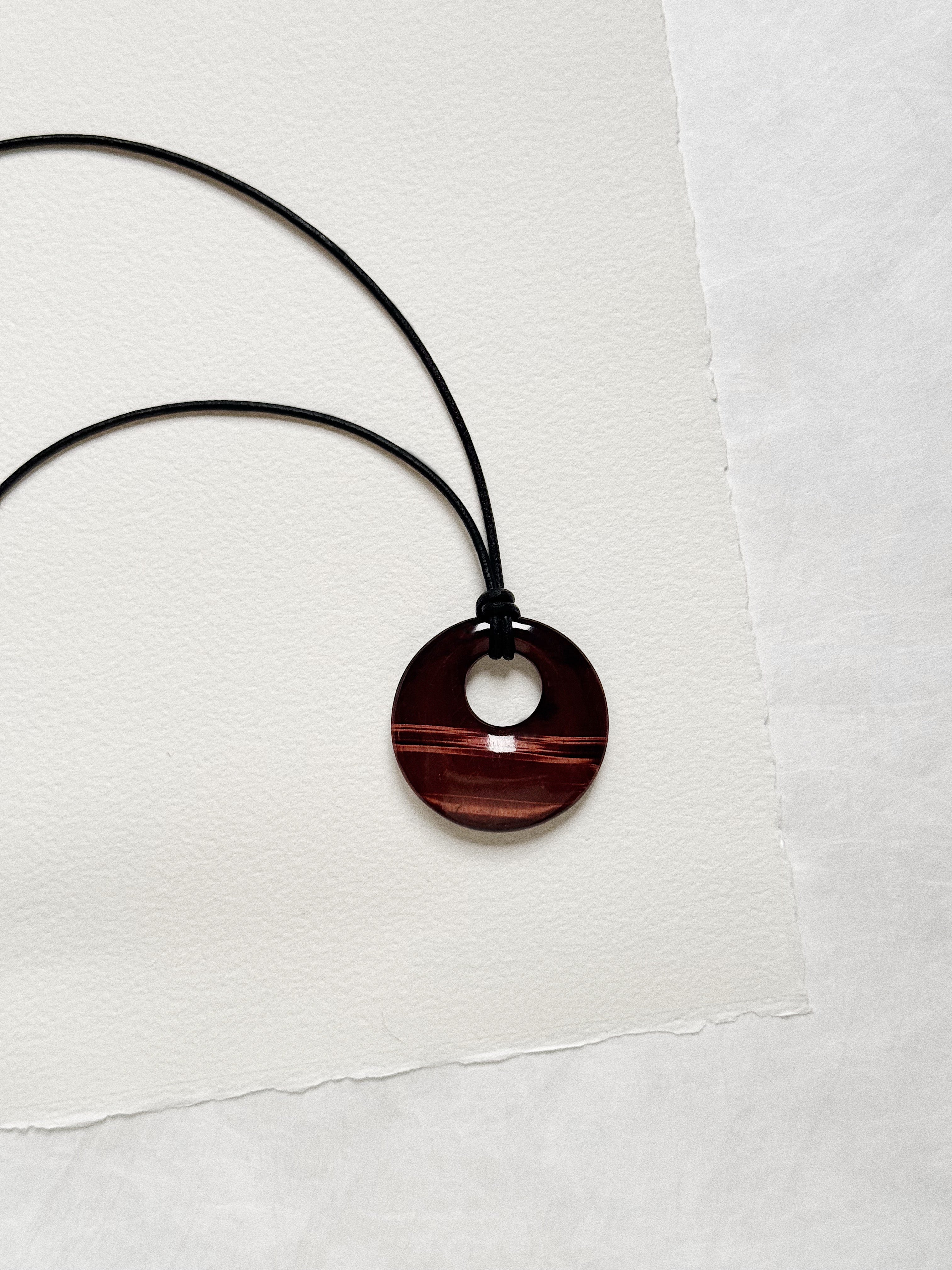 The Luna necklace features a hand-carved natural red tiger eye pendant, embodying the artistry of traditional craftsmanship. Suspended from a supple black leather cord and adorned with sterling silver accents, this necklace exudes understated luxury.