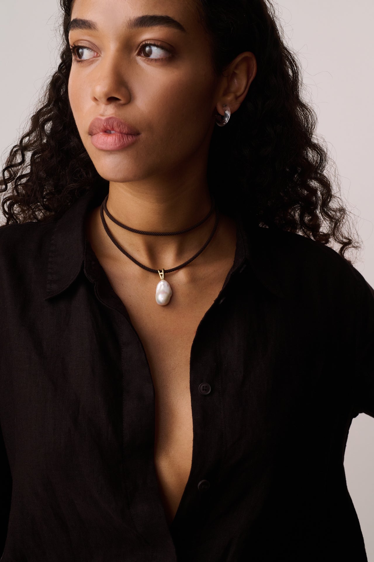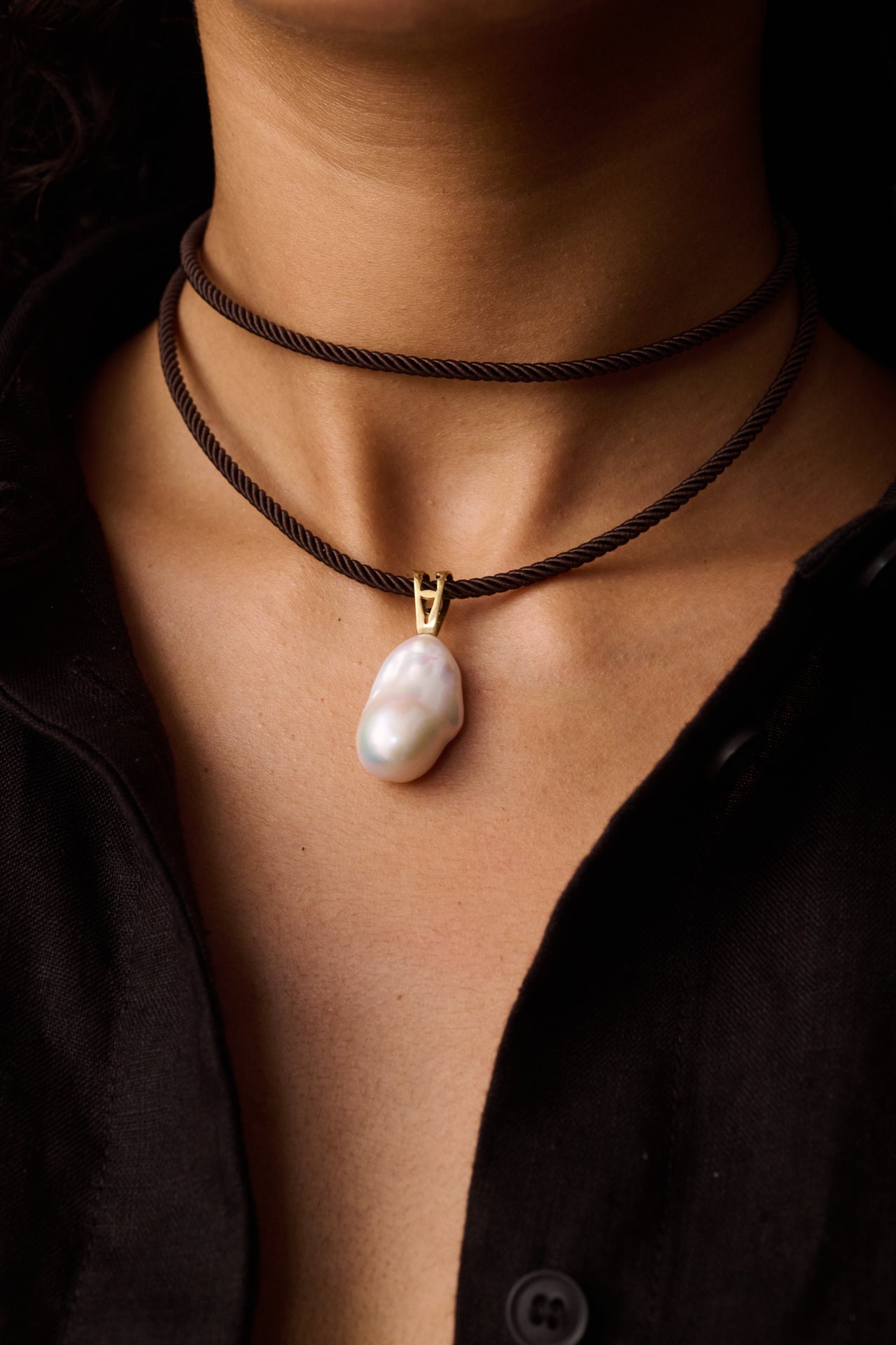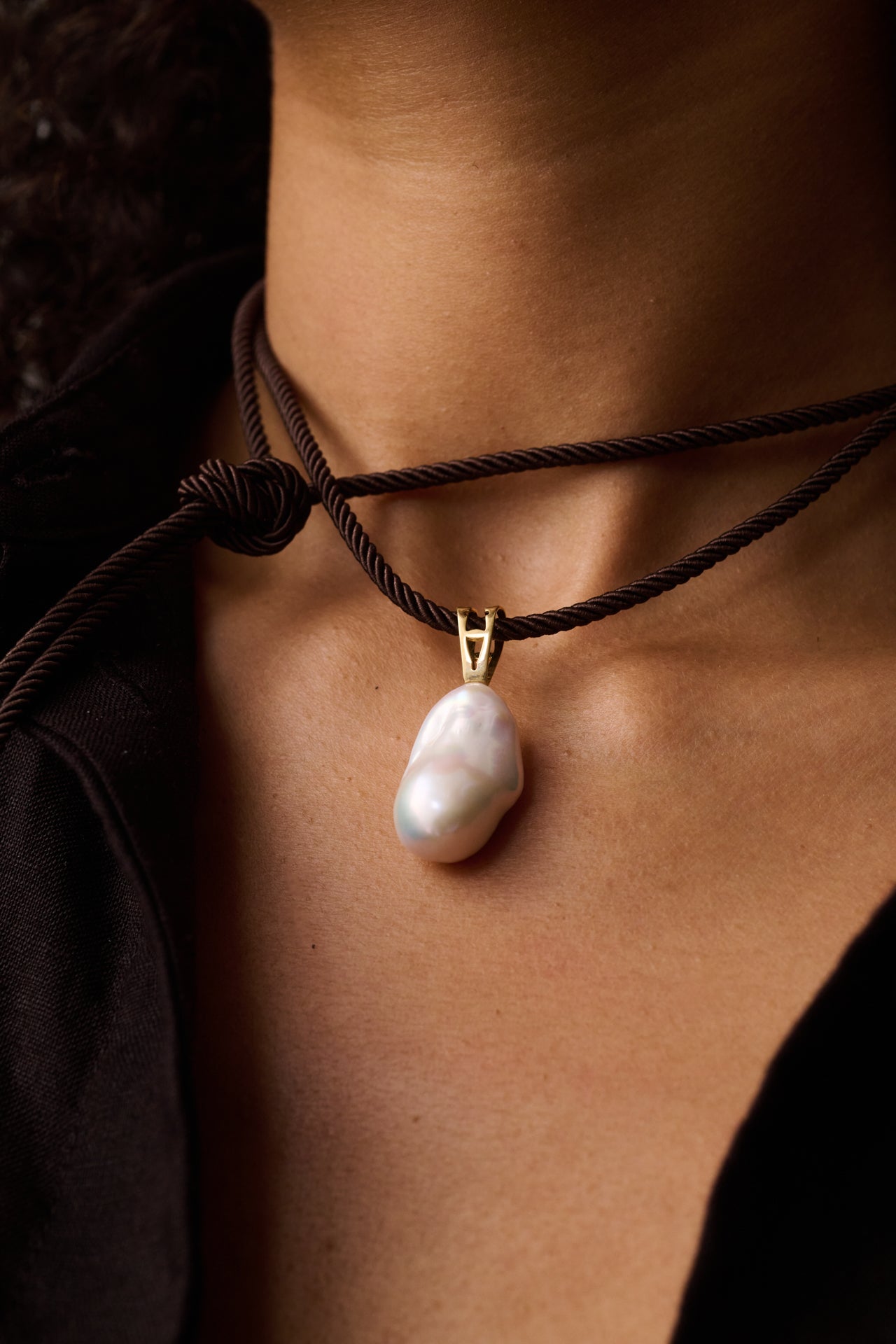 A refined expression of natural elegance. This minimal yet striking piece features a lustrous baroque pearl delicately suspended from a sculptural 14K yellow gold clasp, all tied together with an organic silk cord in a rich beige tone.