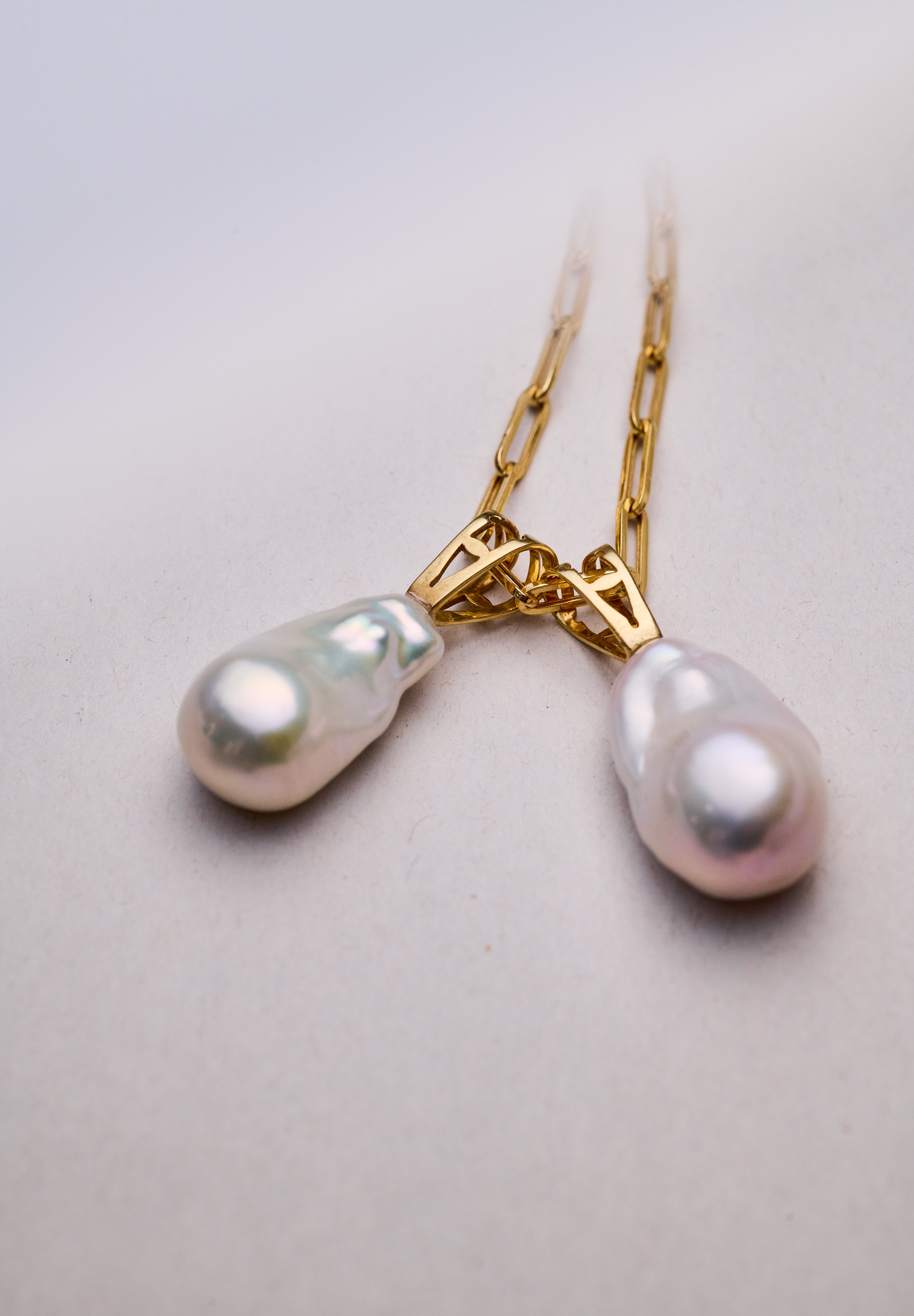 A one-of-a-kind baroque pearl pendant, set in a sculptural 14K yellow gold bail. Naturally shaped and uniquely iridescent, each pearl is hand-selected for its organic form and luminous charm.