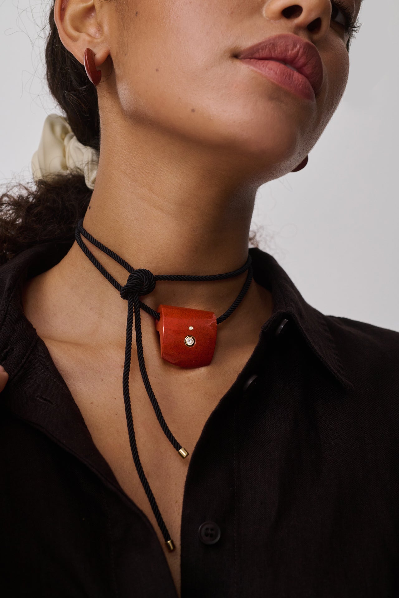 Pendant: Polished Red Jasper inlaid with 0.25-carat natural diamonds.