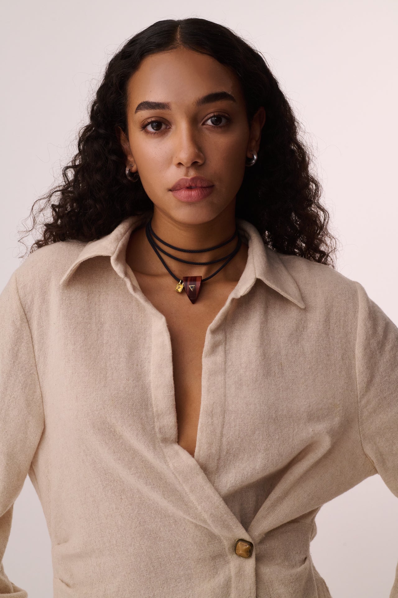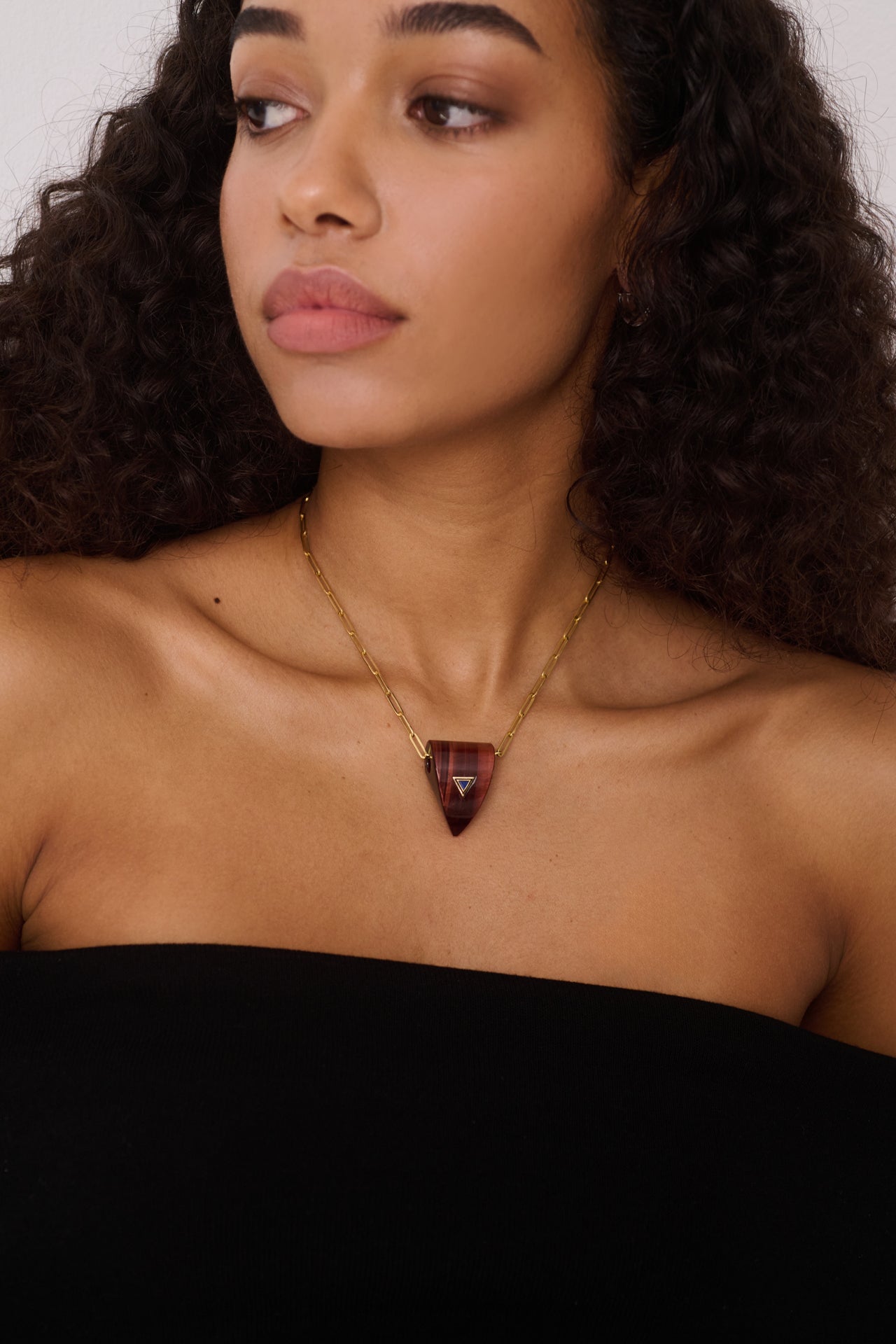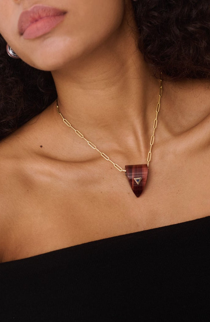 Introducing The TRIA PENDANT: A one-of-a-kind hand-carved Red Tiger’s Eye crystal inlaid with blue sapphire, set in 14K yellow gold in a rounded triangular shape. Each crystal and gemstone is chosen with great care to ensure the highest quality. Handcrafted with precision and artistry, this unique piece combines elegance and balance, embodying pure beauty and timeless craftsmanship.